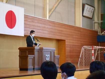 受賞紹介後、始業式での式辞で校長先生からは「セルフ・コンパッション」の話がありました。あるがままの自分を受け入れ、自分自身を思いやることの大切さの話を聴き、生徒たちからも、新学期を新たな気持ちで迎えようとする様子が伝わってきました。