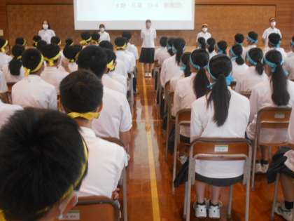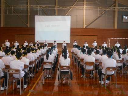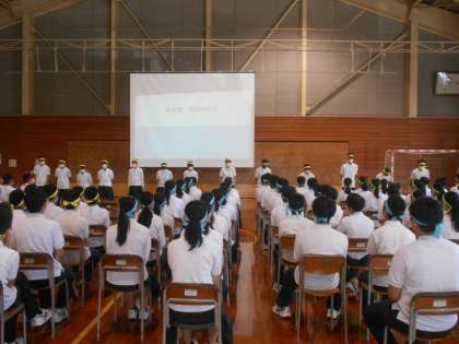 8月31日(水)学年集会(団役員の発表) 公開日 2022/08/31 更新日 2022/08/31 3学年 学年集会では、実行委員、団役員、パネル係、団顧問の紹介があり、代表者は意気込みを話しました。気合いの感じられるいつもとは違う雰囲気の集会となり、学年全体が体育大会に向けての気持ちを高めました。 左:実行委員 中:赤鳳団 右:黄虎団