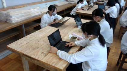 1年生の技術の授業ではミニキャロットを育成しています。種をまいて2週間がたち、芽が出始めました。生徒たちはChromebookを使って観察日記をつけ、ミニキャロットの成長を見守っています。