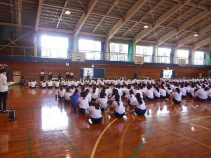今日から体育大会の団演技練習が始まりました。最初に全校生徒が体育館に集まり、体育大会実行委員会から団演技についての説明がありました。