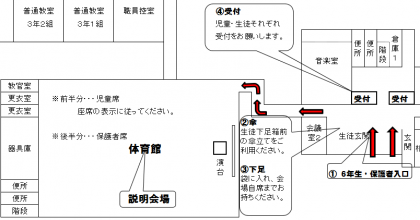 受付後の動線を示しておきますので、体育館へ移動してください。