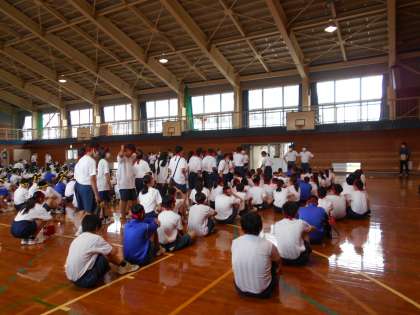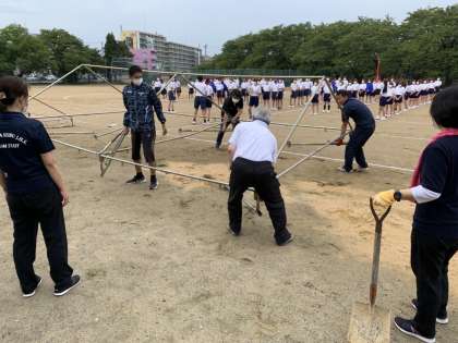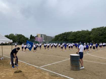 昨日の天気から一転、不安定な雲行きのために予定を変更して、1限に団別練習を行いました。雨が降っていなかったので各団交代でグラウンドで練習をしました。各団、短い時間ではありましたが、当日の動きの確認をしていました。