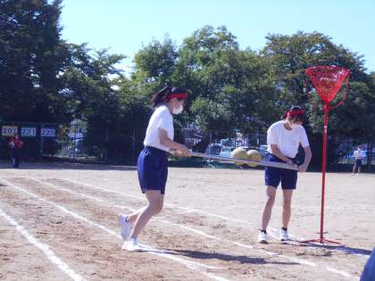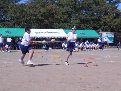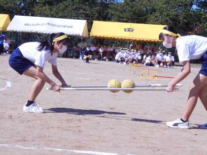 2学年種目「運べ!元気玉 エモい球運び」が行われました。2人一組で2本の棒で2つのボールを挟み落とさないように障害物を越えていきました。