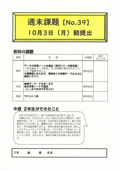 中間考査まで1週間です。土日に学習内容の総まとめをしましょう。