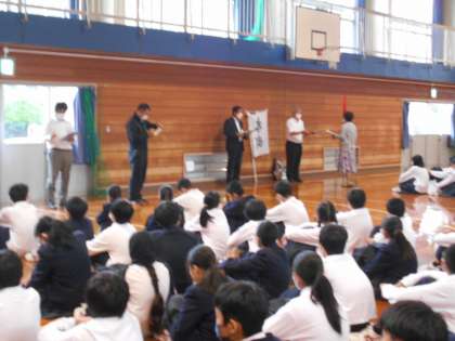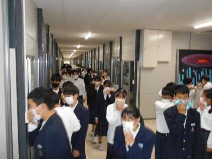 3限に火災を想定した避難訓練を実施しました。1階理科室から出火を想定し、生徒及び教職員は体育館に避難しました。緊迫感の中、生徒はしゃべらず、迅速に避難することができました。
