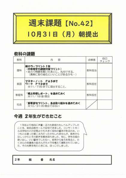 10月28日(金)2学年 週末課題 公開日 2022/10/29 更新日 2022/10/29 2学年 合唱コンクールが終了しました。次なる目標は、中教研学力調査です。 4月からの学習を総復習し、試験に臨みましょう。