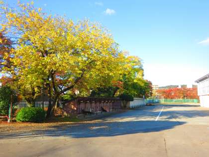 【左】玄関前からグラウンド方面の眺め【右】体育館横のメタセコイヤ