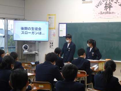 6限に学級討議を行いました。11/2(水)の後期第1回の代議員会・専門委員会で会長や専門委員長から説明された活動計画を、各クラスの委員等が学級でChromebookを使って説明しました。