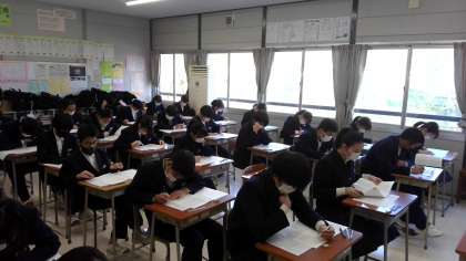 中教研学力調査が行われ、生徒は国語や理科、英語の3教科に取り組みました。明日は、社会と数学の2教科が実施されます。