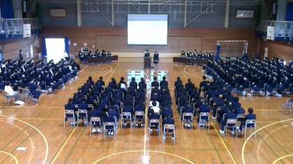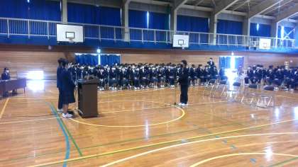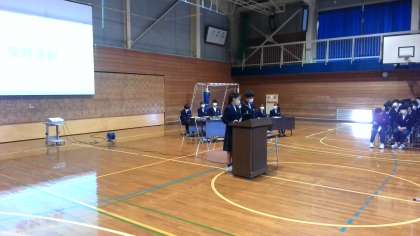 後期の生徒総会が行われ、執行部員と専門委員長から後期活動計画の説明がありました。後期の執行部のスローガンは「輝笑転結」です。活動計画はChromebookを用いて、スクリーンに投影して行ったので、わかりやすい説明でした。よりよい活動にするために生徒からは建設的な意見が提案がされました。