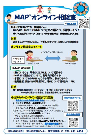 市教育センターでは、学校に行くづらいと感じている子どもたちを対象として、「MAPオンライン相談室」を実施いたします。MAP指導員に相談や質問ができるオンラインです。