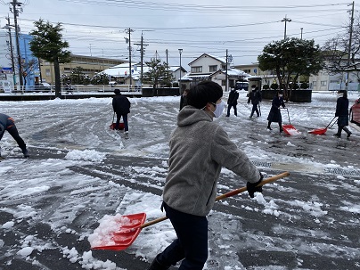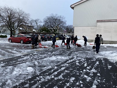 今日の除雪当番は、3年1組でした。登校した生徒や懇談会で来校される保護者の方が、入りやすいように玄関や駐車場を除雪しました。