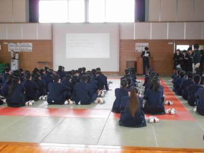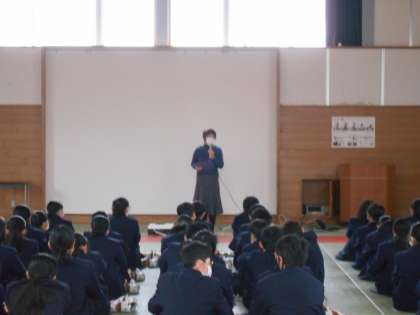 いよいよ2学期も残すところあと1日になりました。今日は学年集会を誠武館でしました。学年生徒会からまとめの発表、生徒指導から冬休みの過ごし方について話がありました。学年主任からは、あと数ヶ月で2年生になる。3学期を準備の期間として大切に過ごすよう指導がありました。