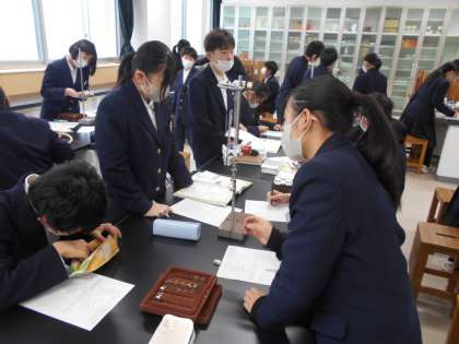 1年生の理科ではバネはかりを使って実習をし、おもりの数とバネの伸びの関係を調べました。