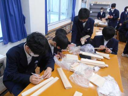 2年生の技術では本立てを組み立てるため、釘を打つ箇所に印をつけました。