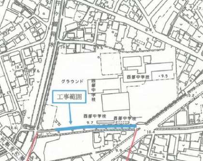 西部中学校グラウンド横の桜並木道の道路改良工事のため下図の通学路が通行止めになります。通行止め期間中は、迂回して登校してください。