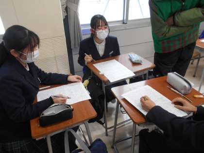 3年生の理科ではプリントに取り組み、分からないことをグループで教え合いました。