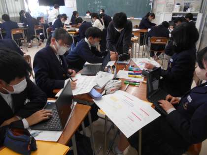 【左写真】1年生の総合的な学習の時間では、班ごとにSDG'sの17の目標の中で自分たちが取り組めることについての発表準備をしました。