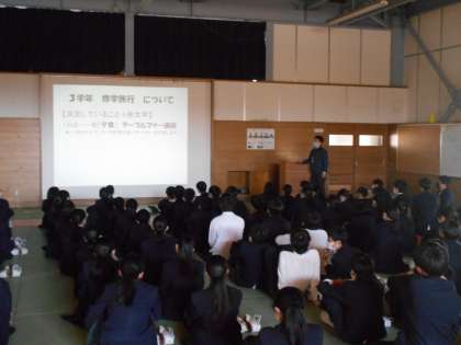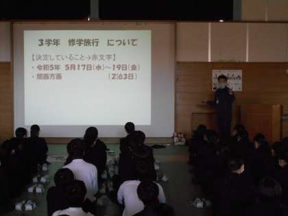 学期末考査もおわり、2年生も終わりに近づいてきました。今日は誠武館で学年集会をしました。学年主任から来年度の修学旅行について話がありました。生徒は修学旅行を楽しみにしている様子でした。