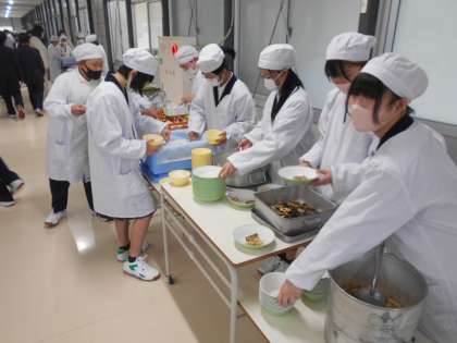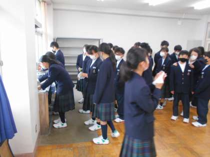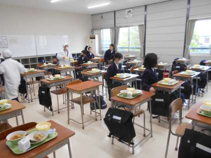 給食開始から3日目です。1年生は配膳等の準備にも慣れ、スムーズにできています。洗面場では整列して、順番に整列し手洗いを行っています。