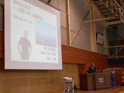 4限に創校記念式を行い、本校の第39回卒業生の金谷幸則さんを講師に招き、講演をしていただきました。金谷さんからは「夢をもつことの大切さ」や「出会いを大切にすること」、「本気で生きること」を話していただきました。