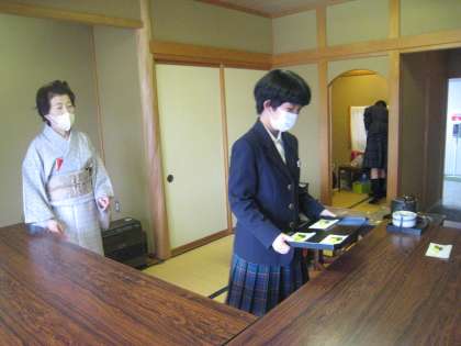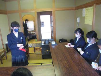 1年生は色々な部活動をまわって体験しています。3年間続けるためにも24日まで慎重に考えて選んでください。写真は茶道部の様子です。
