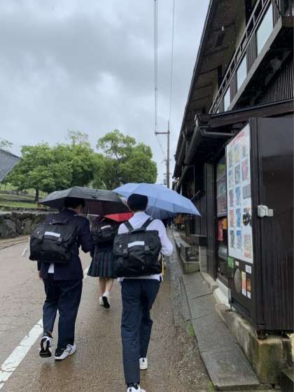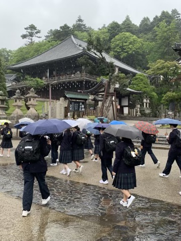 3組は、東大寺から徒歩で春日大社へ行きました。途中、二月堂に立ち寄りました。春日大社では祭事「薪御能」が行われていました。
