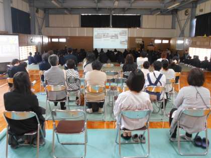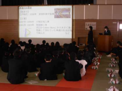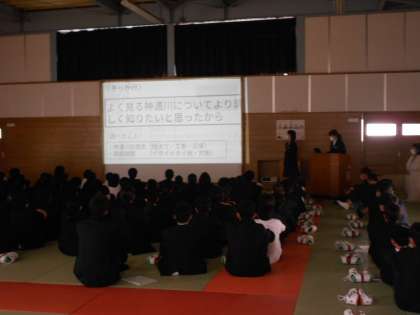 1年は総合的な学習の時間「富山調べ」の学年発表会です。市電や神通川等について知っているようで知らないことがいっぱいあり、生徒はもちろん、保護者の皆様も熱心に聞いておられました。
