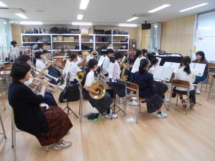 壮行会の選手入退場は吹奏楽部が演奏します。大会に出場する選手のために、前日練習を頑張りました。