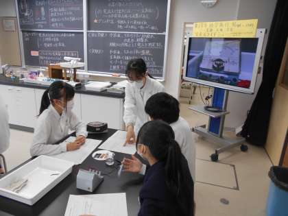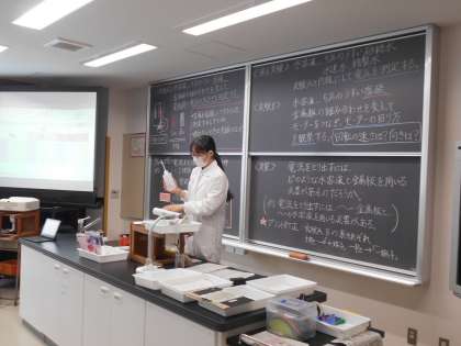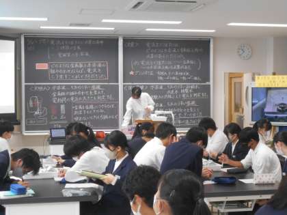 教育実習生の1名が3年生の理科の授業を行いました。3種類の中から2枚金属板選び、うすい塩酸の中に浸して、電圧を測定する実験をしました。生徒は電圧計の目盛りを読み取り、記録していました。生徒たちはどのような条件で電流を取り出すことができるか真剣に考えていました。