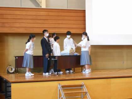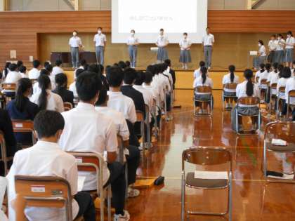 ステージ上の富商生が接客用語の発声のお手本を示してくれます。急遽、生徒3名が接客の実演を行うことになりましたが、堂々とした接客ぶりでした。