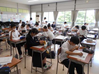 1年2組英語では、ALTの先生に対して自己紹介のスピーチテストを行い、生徒たちはとても緊張した様子でした。順番を待つ人は個々にリハーサルをしていました。