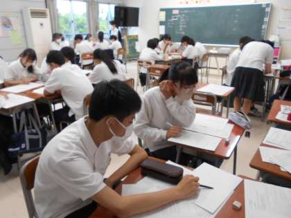 2年はグループで協力しながら、期末考査の答え直しをしています。