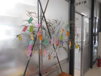 3年教室のの入口には、ささやかな七夕飾り。ミニ短冊には大きな願い事が書いてありました。
