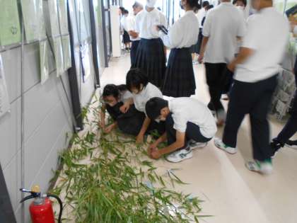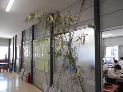 1学年主任が近所の方から天井まで届く大きな竹を3本いただきました。今日、生徒たちは短冊に願い事を書き、各クラスの前に飾りました。