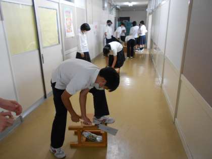 技術ではのこぎりびきの練習。小学校でちょっとだけ使った人が多いようです。