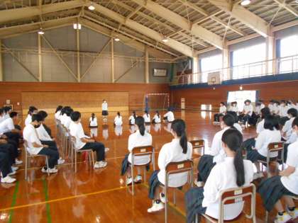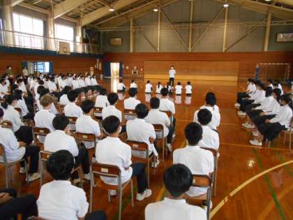9月の体育大会の実行委員と各団リーダーに立候補した生徒たちによる演説会がありました。体育館の暑さに負けず、大きな声で体育大会に懸ける思いを演説していました。