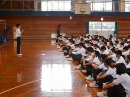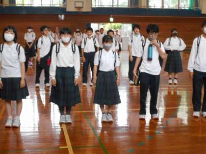 本日、1学年は富山市内を班別で行動する校外学習を行っています。体育館では出発式を行い、9時前には全ての班が元気に出発しました。