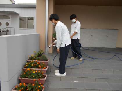 下校時、環境委員長さんとその友達が花に水をやってくれました。