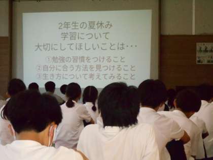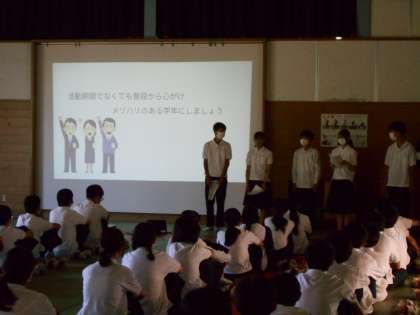 学年生徒会より1学期の活動報告(左) 夏休みの過ごし方(中央) 夏休みの学習について(右)