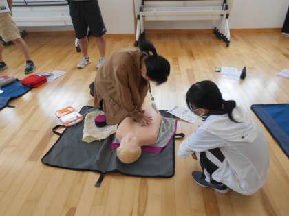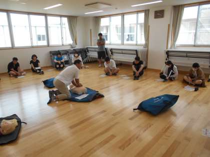 日本赤十字社富山県支部から赤十字救急法指導員を招いて、教職員対象のAEDを用いた心肺蘇生法講習会を実施しました。心肺蘇生法は毎年1回実施しており、一次救命処置の心肺蘇生とAEDの使用について確認しました。