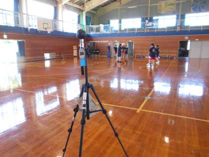 写真左からWBGT(暑さ指数)測定の様子、体育館で活動中の男女バスケ部
