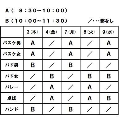 先日から猛暑日が続き、午後から体育館のWBGT(暑さ指数)が活動中止の「31」を超えています。今後もWBGTが活動中止の「31」を超えることが予想されるため、体育館での部活動は8/3(木)〜8/9(水)期間の午後の活動は中止とし、以下のように変更します。また、活動時間も90分間に変更します