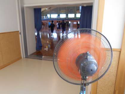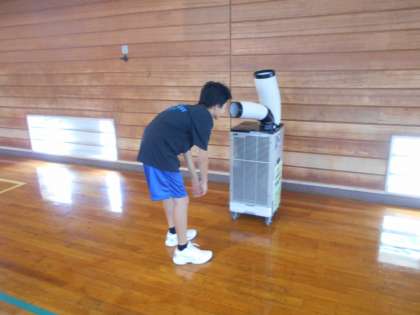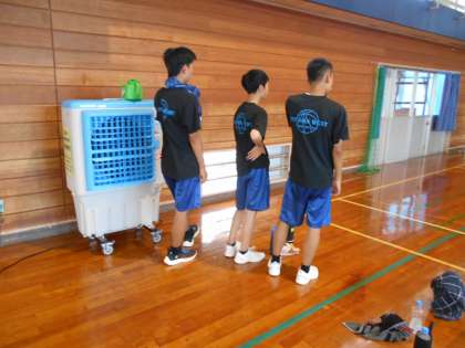 体育館の熱中症対策として、冷風機2台が設置してあります。また、最寄りの教室のエアコンを稼働させ、扇風機で体育館に送風しています。休憩時、バスケ部員は水分補給に加え、冷風機の風に当たって身体の熱を下げていました。