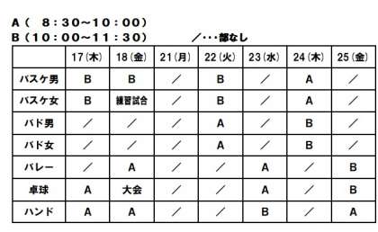引き続き猛暑日が続き、午後から体育館のWBGT(暑さ指数)が活動中止の「31」を超えています。今後もWBGTが活動中止の「31」を超えることが予想されるため、体育館での部活動は8/17(木)〜8/25(金)期間の午後の活動は中止とし、以下のように変更します。また、活動時間も引き続き90分間で実施します