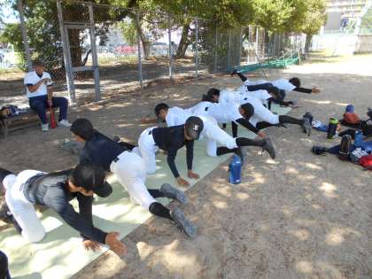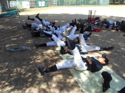 お盆休み明けの部活動が再開しています。WBGTの値は昨日今日と「厳重警戒」にとどまっており、グラウンドでは野球部が日陰を利用してトレーニングに取り組んでいました。
