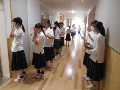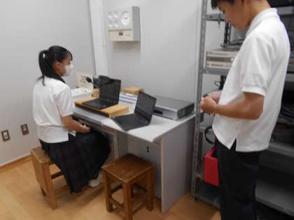 体育大会で1、2年の団役員が自己紹介するとともに、放送マイクの前で決意表明しました。