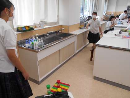 2組家庭科では、夏休みの課題だった「子どものおもちゃ」づくりの作品を持ち寄り、使って遊んでみたり、班で工夫点を発表したりしていました。手の込んだ、子どもが喜びそうなおもちゃがいくつもありました。