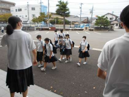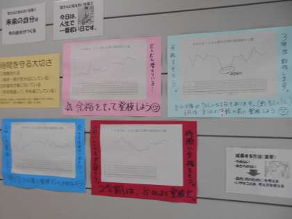 体育館と仮設教室の間の通路に、4月以来の8時10分以降に登校した人数の推移をグラフにしたものが掲示されています。毎朝、生徒指導の先生がカウントしています。