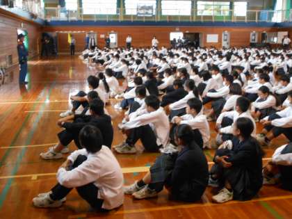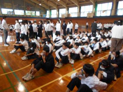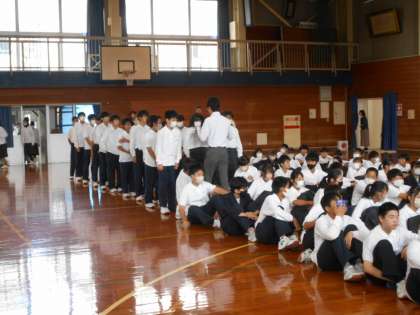 富山消防署の方3名が見守る中、避難訓練を実施しました。今回は担任ではなく、教科担当が授業しているときに非常ベルが鳴る設定でした。それでも、生徒も教職員も落ち着いて避難し、しっかりと人員確認できました。